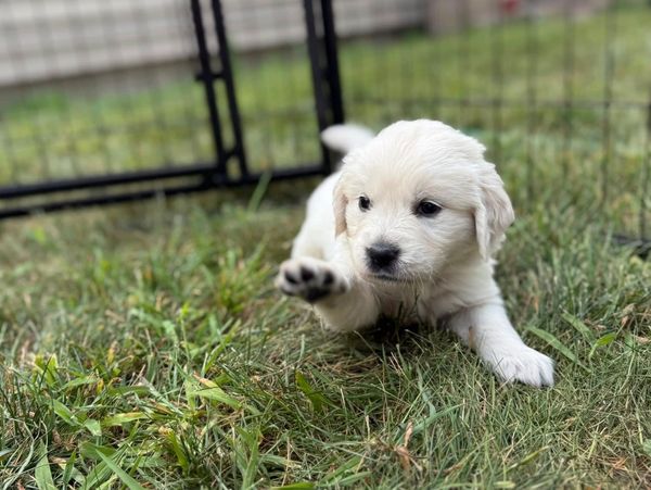 At Lakeside Pines, we prioritize the health and happiness of our English Cream Golden Retrievers. Our breeding program focuses on producing well-tempered and healthy puppies that meet the highest standards. AKC registered, vet checked, vaccines, de-wormed. BOTH PARENTS have been DNA tested for genetic diseases and are CLEAR. OFA results: good. At 3 weeks we introduce the pups to crate training and begin potty training at this time as well. Temperament testing at 7 1/2 weeks allows us to best place the right pup with the right family. All pups are born and raised indoors with mom and are well socialized by our family. We have an open-door policy with our clients and believe in transparency. We will always do our best by you and your new family member!